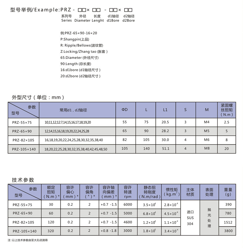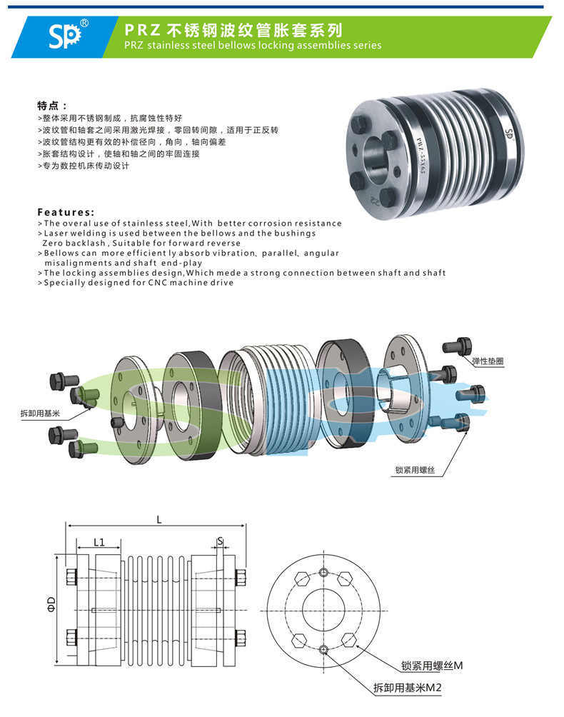 整体采用不锈钢制成,抗腐蚀性特好 波纹管和轴套之间采用激光焊接,零回转间隙,适用于正反转 波纹管结构更有效的补偿径向,角向,轴向偏差 胀套结构设计,使轴和轴之间的牢固连接 专为数控机床传动设计