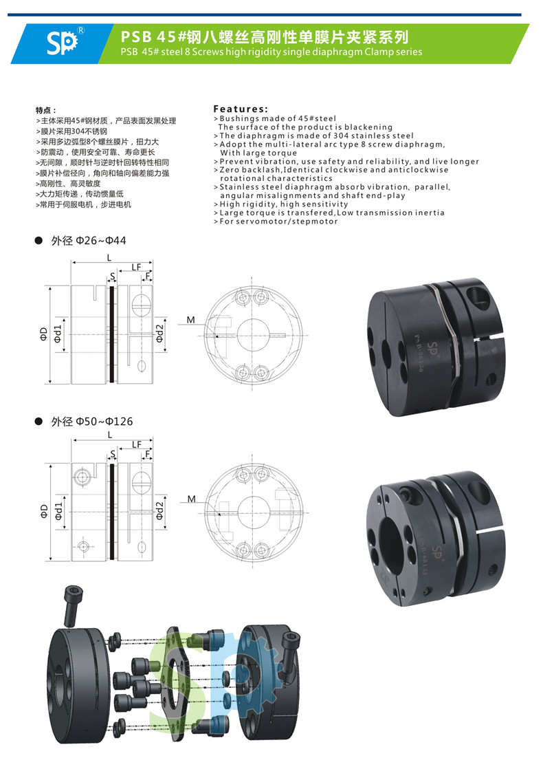 主体采用45#钢材质,产品表面发黑处理 采用多边弧形8个螺丝膜片,扭力大 防震动,使用安全可靠,寿命更长 无间隙,顺时针与逆时针回转特性相同 膜片补偿径向,角向和轴向偏差能力强