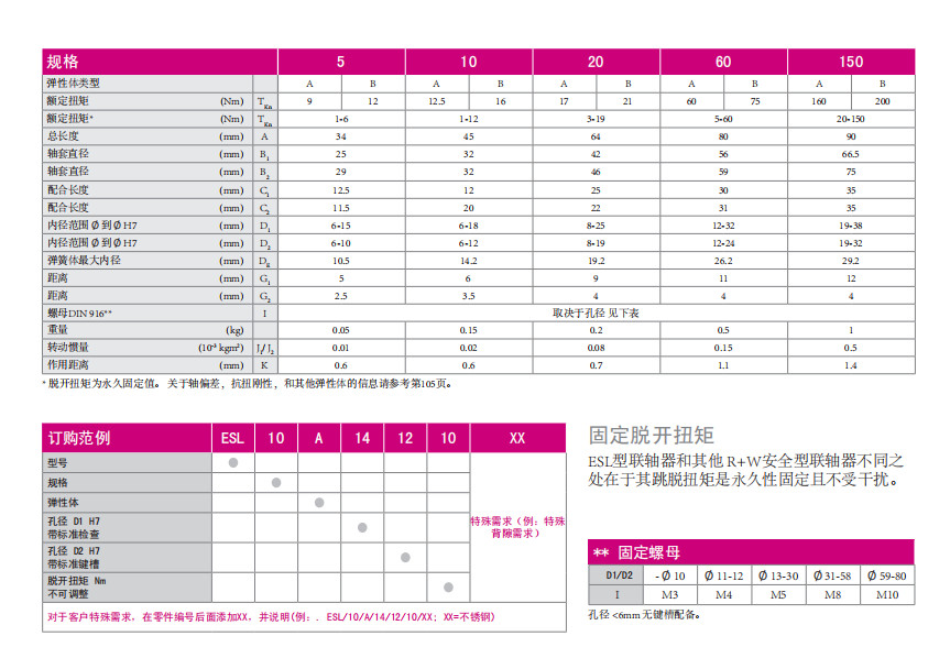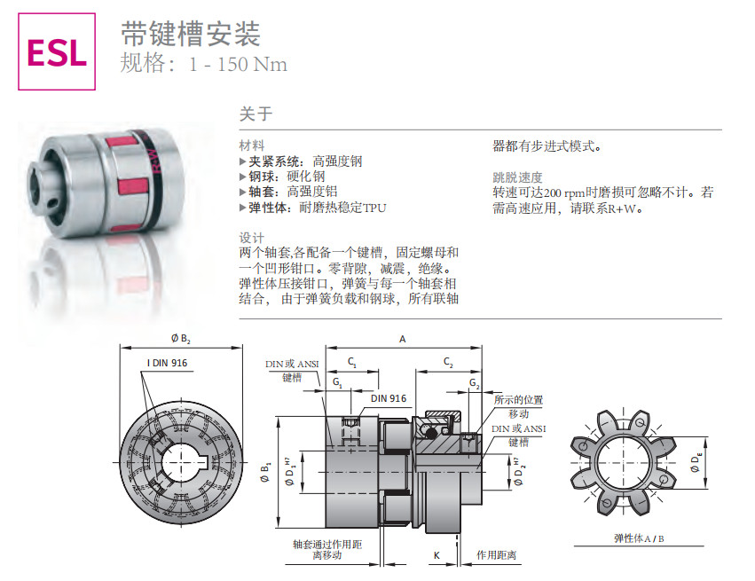 夹紧系统:高强度钢 钢球:硬化钢 轴套:高强度铝 弹性体:耐磨热稳定TPU 设计:两个轴套,各配备一个键槽,固定螺母和一个凹形钳口。零背隙,减震,绝缘。弹性体压接钳口,弹簧与每一个轴套相结合,由于弹簧负载和钢球,所有联轴器都有步进式模式。