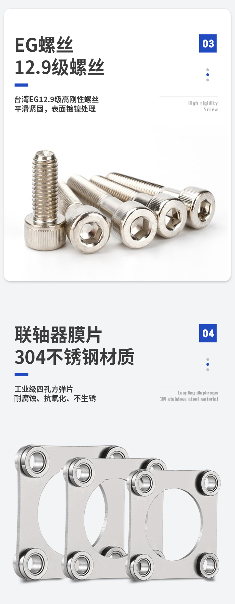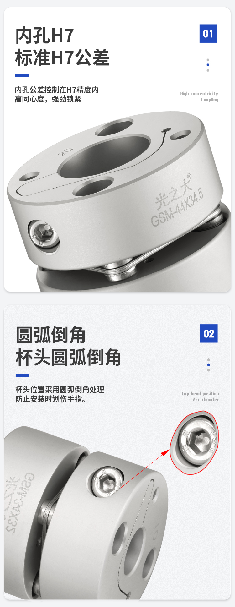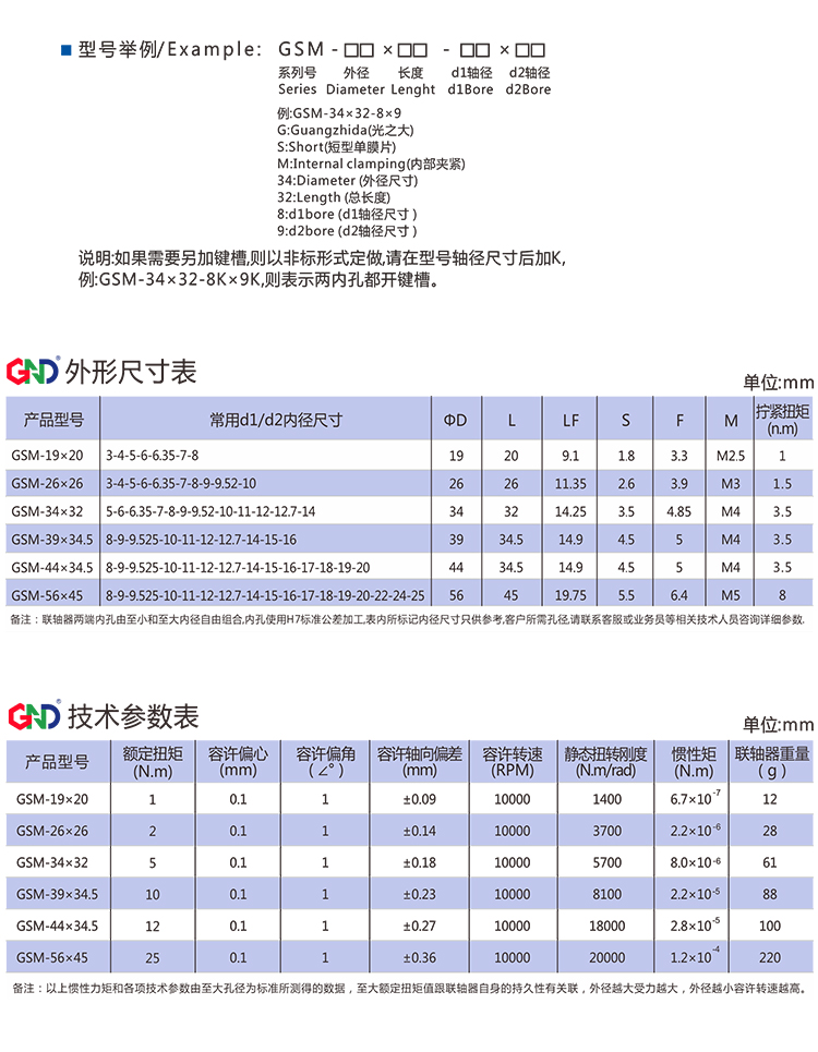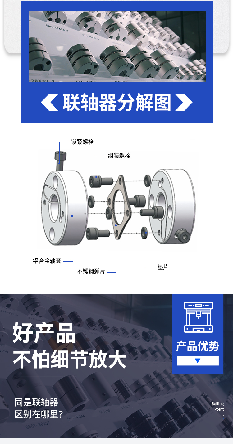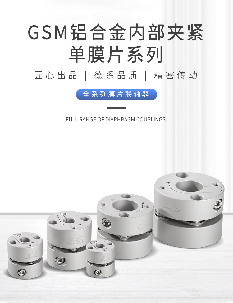 >轴套采用高强度铝合金 >膜片采用304不锈钢 >内部夹紧减少安装误差 >扭矩刚性高,能准确控制轴的旋转,可进行高精度控制 >专为伺服,步进电机设计 >无间隙的轴和轴套连接,适用于正反转 >低惯量,适用于高速运转 >内部夹紧螺丝紧固方式