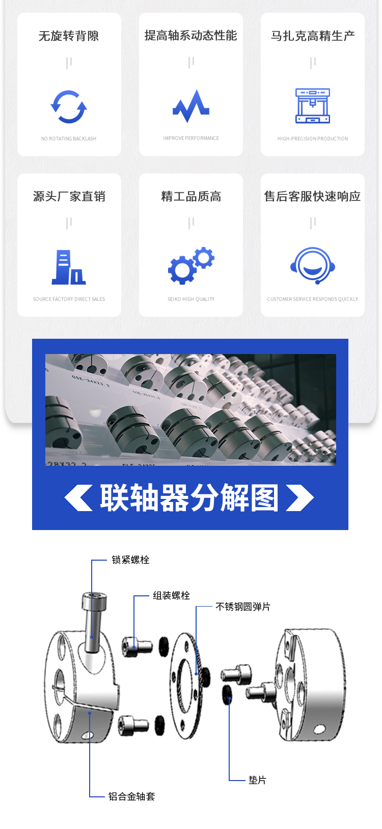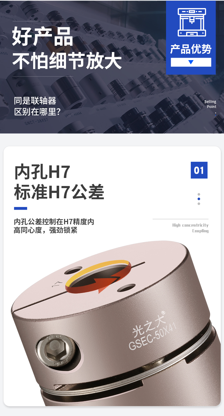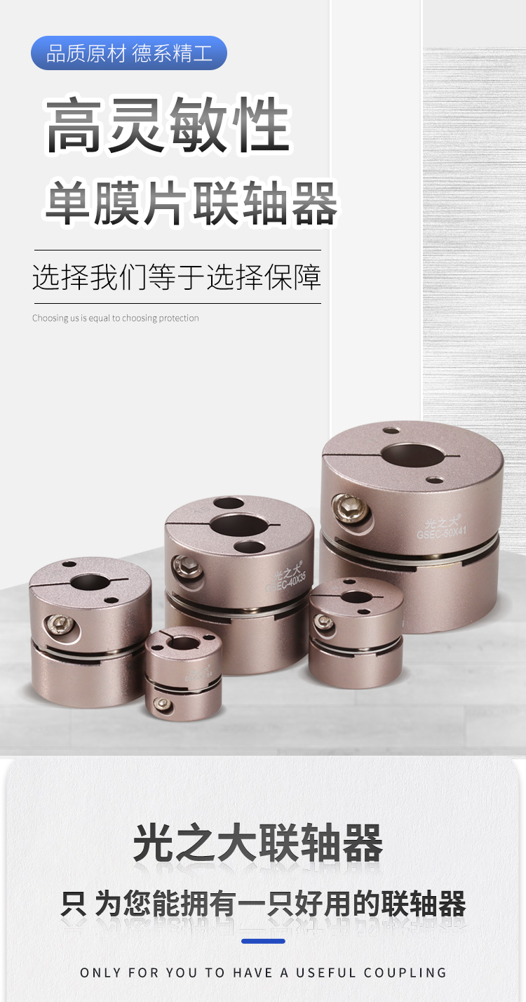 >轴轴套采用高强度铝合金 >膜片采用304不锈钢. >扭转刚性高,能准确控制轴的旋转可进行高精度控制. >无间隙的轴和轴套连接专为伺服,步进电机设计 >超低惯量,高灵敏度,适用于高速运转 >顺时针与逆时针回转特性完全相同 >不锈钢膜片补偿角向和轴向偏差