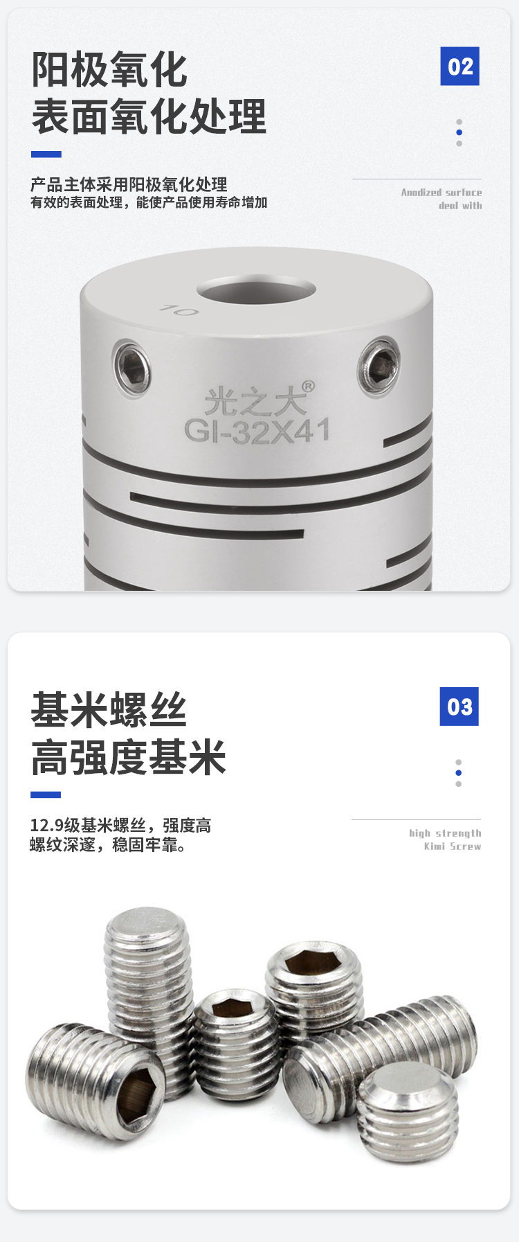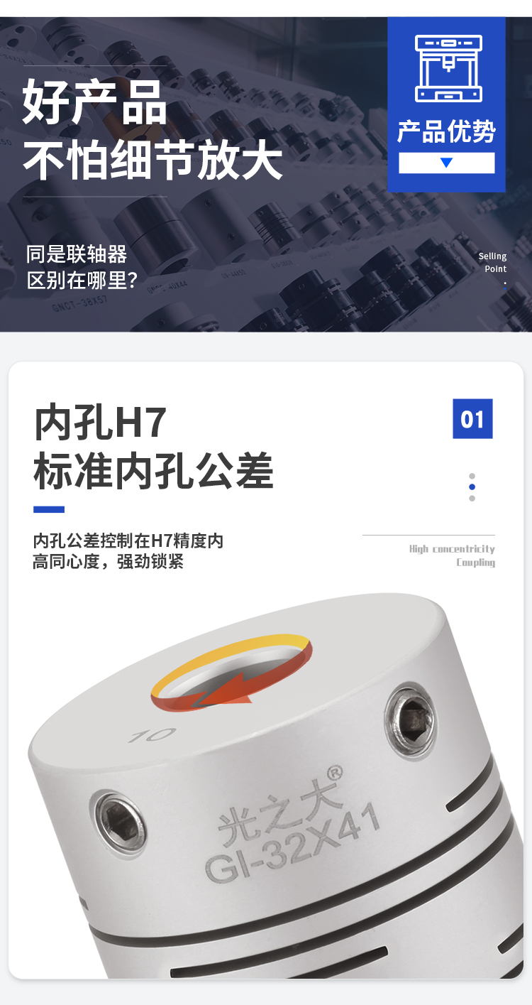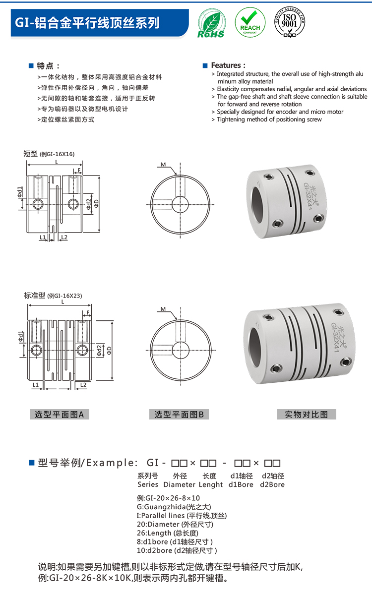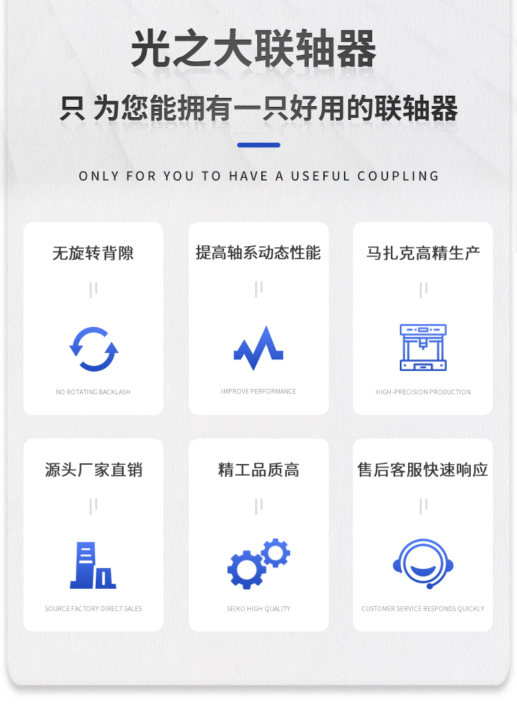 >一体化结构,整体采用高强度铝合金材料 >弹性作用补偿径向,角向,轴向偏差 >无间隙的轴和轴套连接,适用于正反转 >专为编码器以及微型电机设计 >定位螺丝紧固方式